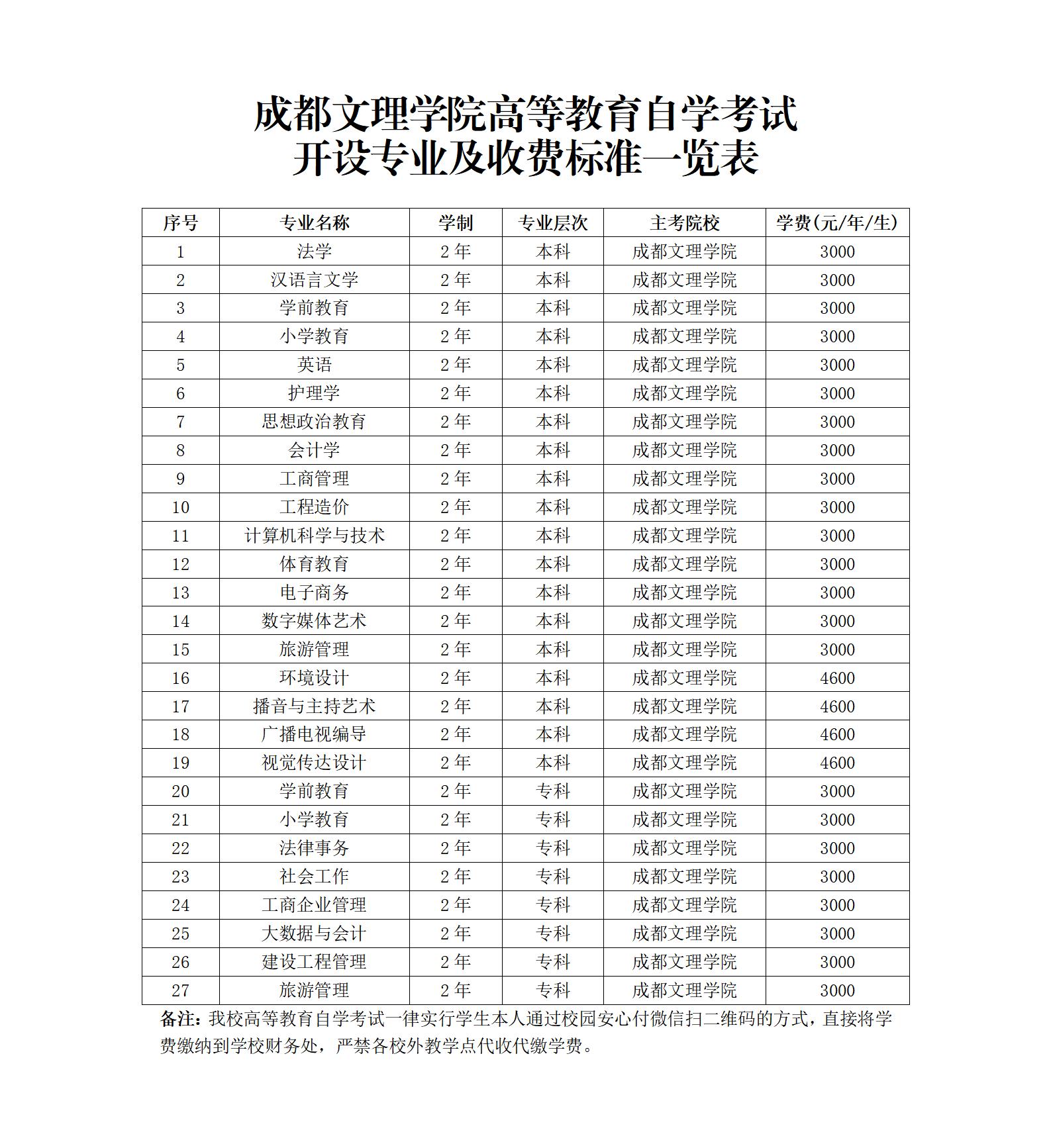 304永利集团有限公司高等教育自学考试开设专业及收费标准一览表