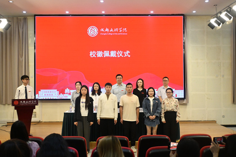 领导为新生代表佩戴校徽并合影。